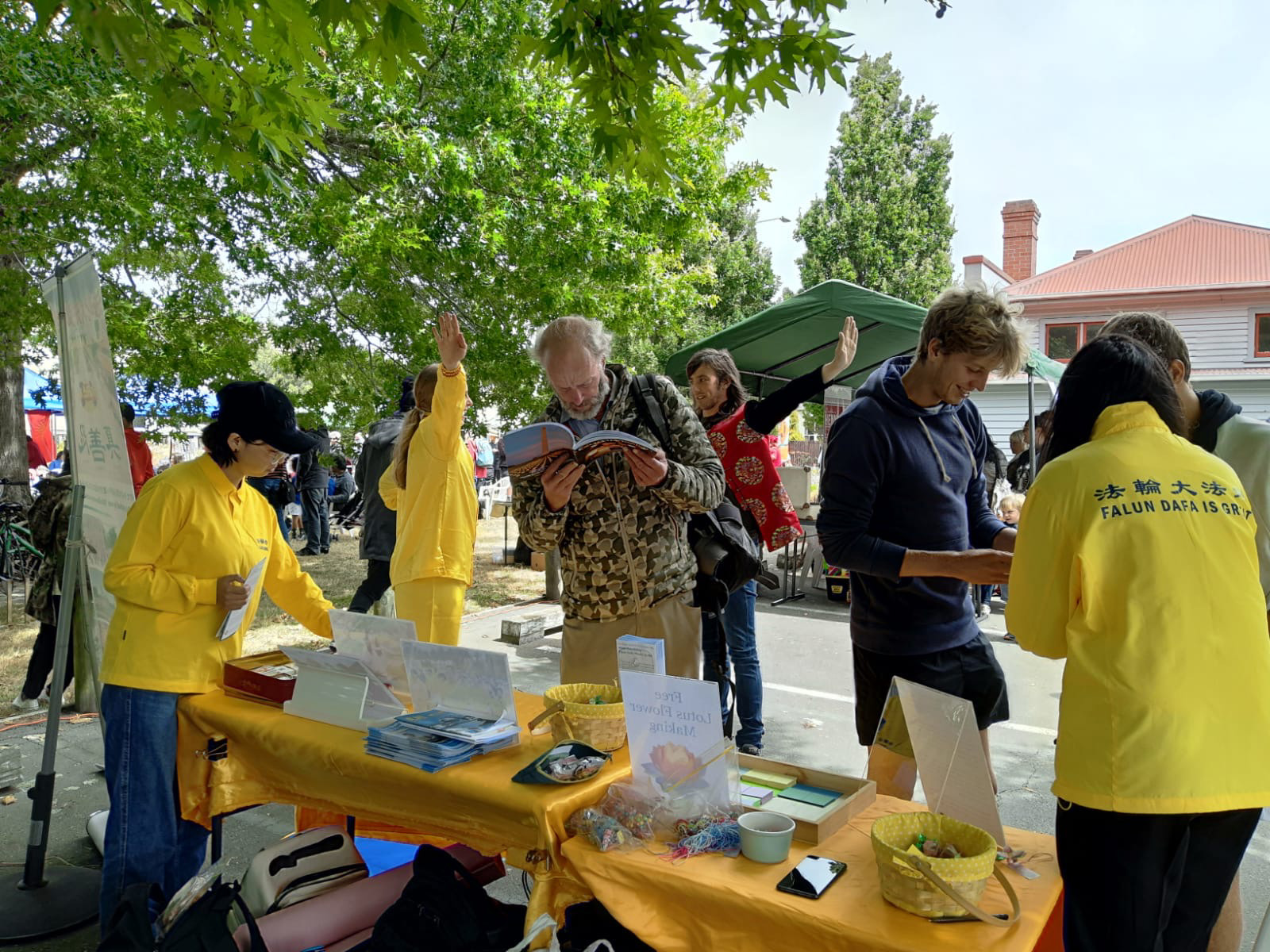 法轮大法的摊位不但吸引了众多当地人,也有华人主动过来与学员们攀谈,了解真相后做了“三退”(退出中共党、团、队组织),为自己选择了光明的未来。
