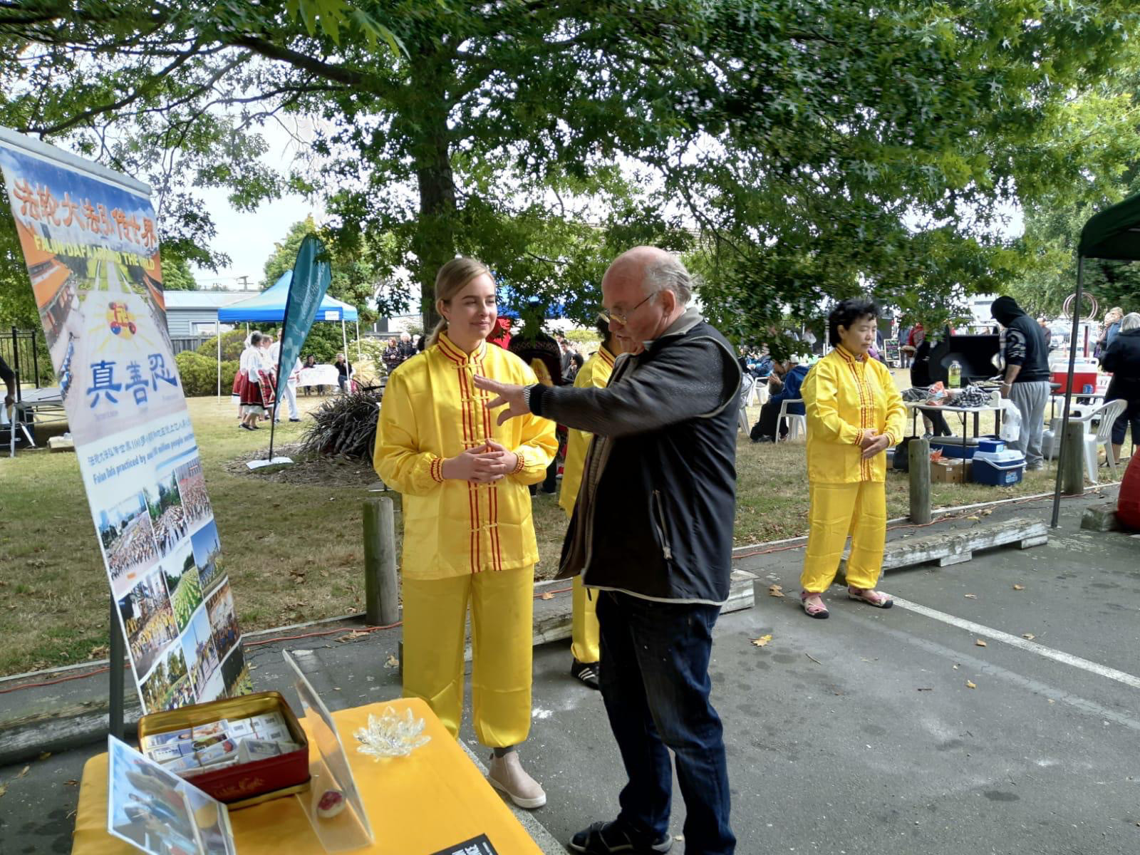 一位北京机关的退休干部走过来观看,学员在与他的交谈中得知,他是因“武汉疫情”滞留在基督城的游客,因心情烦闷与太太出来散心。学员就从中共不顾百姓死活刻意隐瞒疫情谈起,讲了中共邪党自篡政七十年来,历次政治运动对半数以上中国人的迫害,给中华民族带来的灾难,尤其是二十年来对修心向善的法轮功学员残酷迫害,甚至活摘法轮功学员器官的罪行。