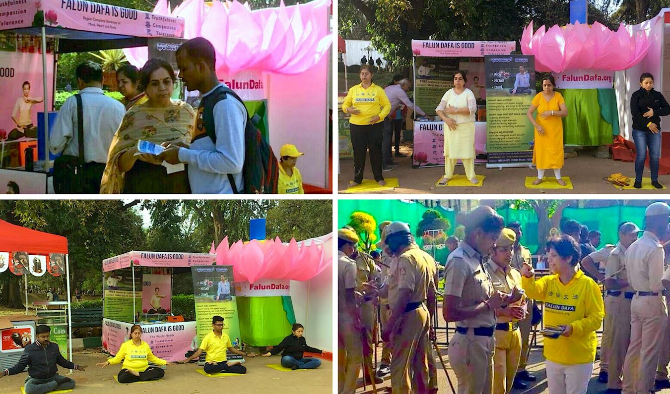 花展时间每天从上午十点到下午七点,长达九个小时,班加罗尔的学员们就分期分批地来到展位,有的派发真相传单,有的展示功法,有的为过往民众介绍法轮功在全球弘传一百多个国家和地区的盛况,以及中共对法轮功的迫害至今还在中国大陆持续的真相。有不少游人前来了解法轮功是什么以及在哪里学炼法轮功和了解法轮功的功理功法,有的还购买了法轮功书籍。