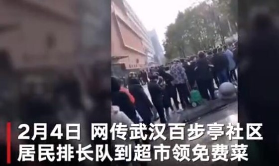 2月4日,武汉百步亭社区被指有居民排长队到超市领免费菜,有网友担心这种做法存在继续交叉感染的风险。