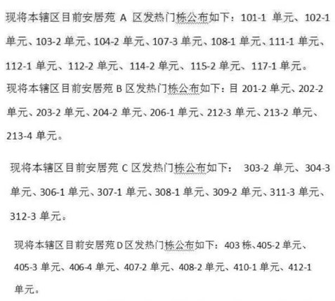 武汉百步亭辖区内的安居苑、百合苑业主群内有人公布了截止到2月4日,小区内出现发热病人的门栋信息。从数据上看,安居苑共 55 栋楼里,33 栋出现发热病人;百合苑共36栋楼里,17栋出现发热病人。其中,安居苑A区有12个单元,B区有8个单元,C区有8个单元,D区有7个单元+403栋全栋;百合苑有20个单元+208栋全栋。