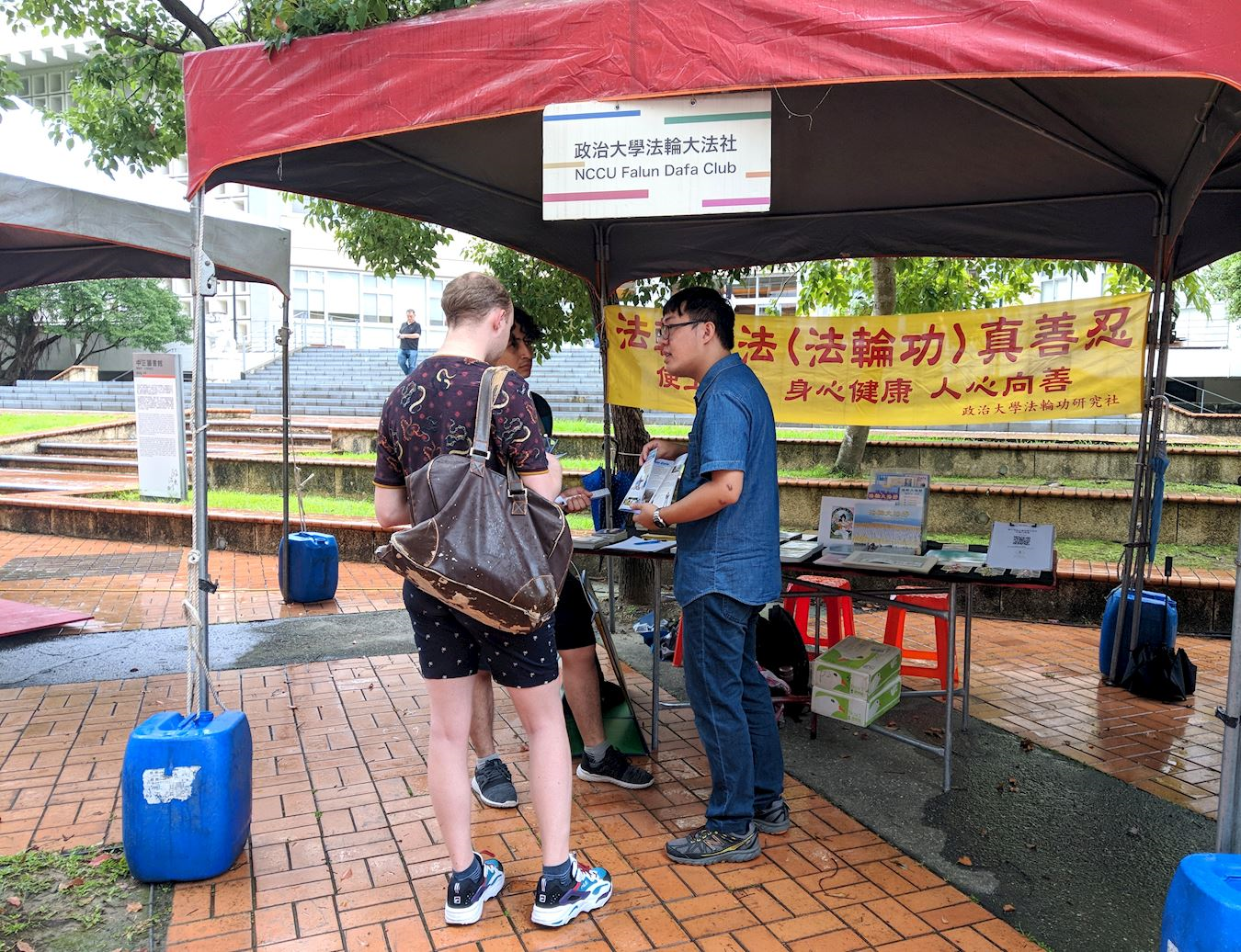 图1:政大法轮大法社的成员在大学社团联展上设立展位,传播法轮功真相洪法。