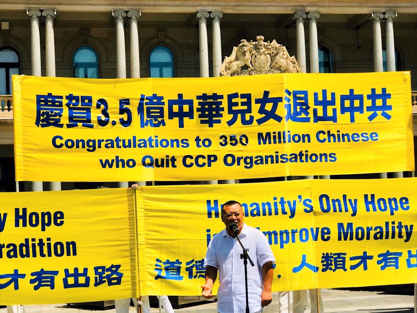 王先生是一位移民到澳洲的普通公民,他在中国生活了二十五年,深知中共的邪恶本质。之前他来澳洲旅游时在景点遇到了法轮功学员并退出了中共的团、队组织。他在中文《大纪元》报纸上看到“支持三亿五千万勇士退出中共集会”的消息后,特地来参加集会并要求即兴发言。