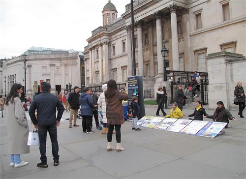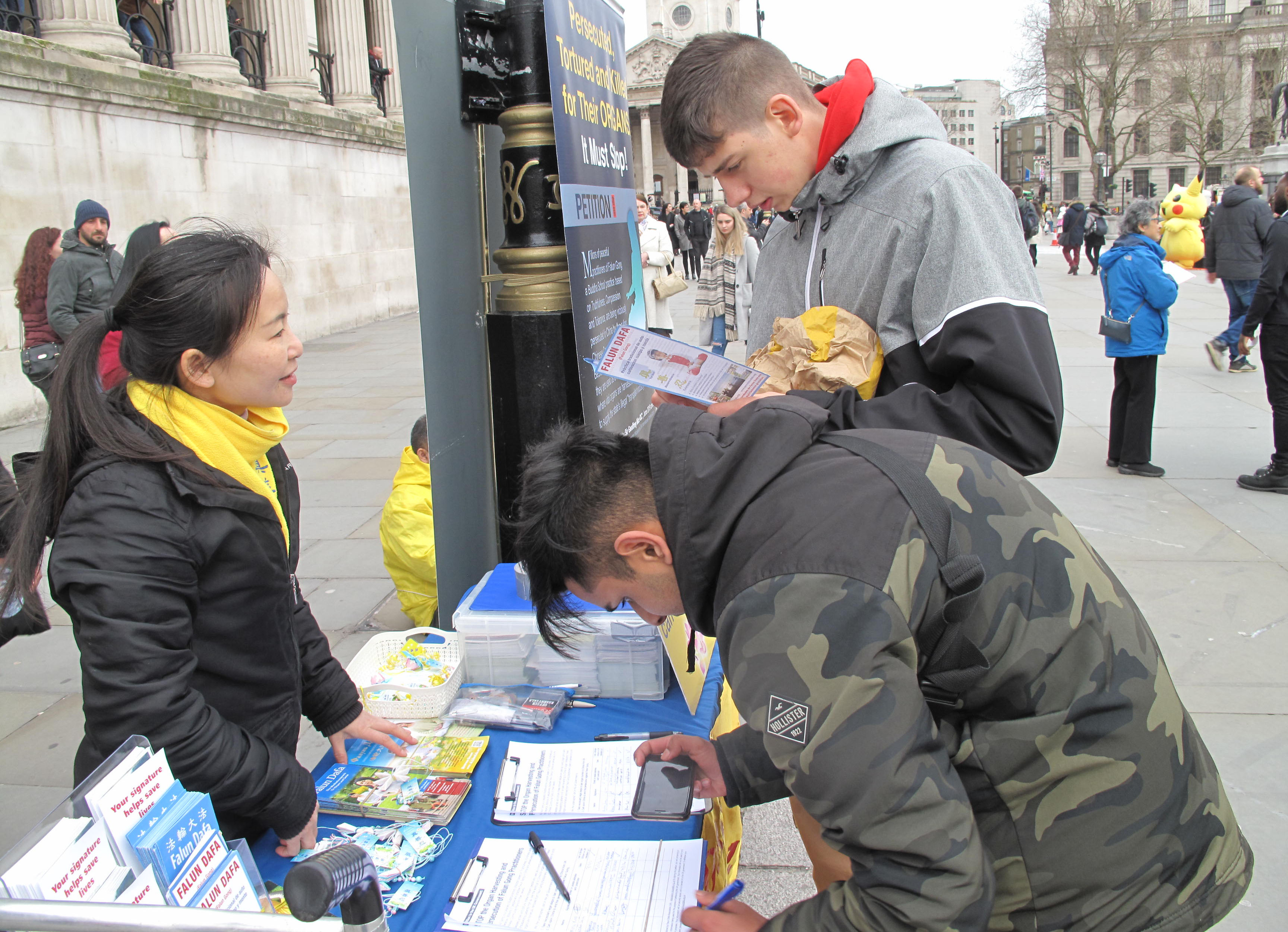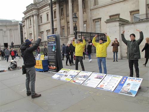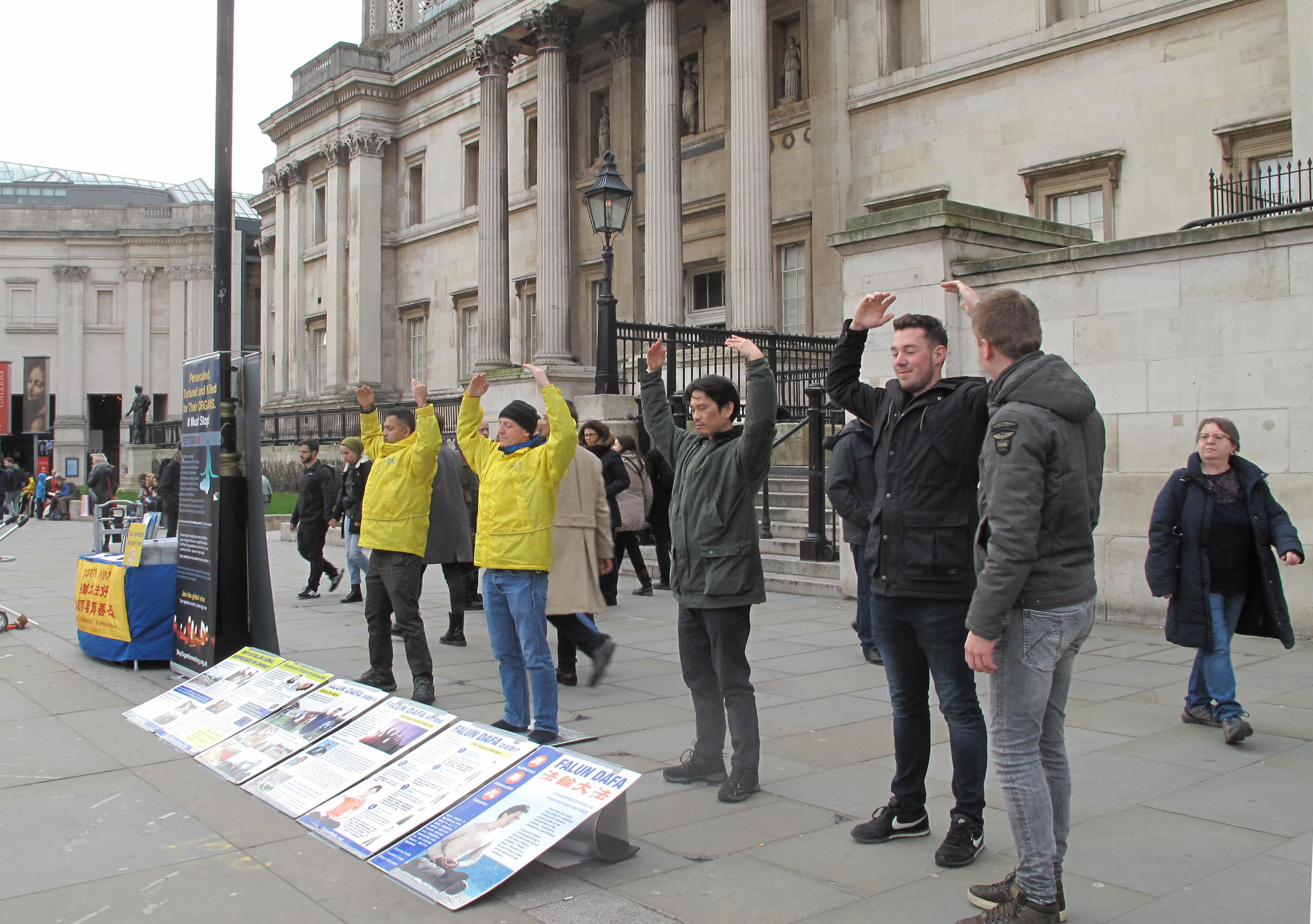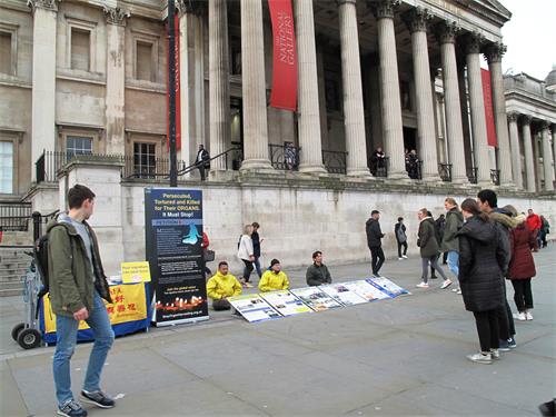 英国法轮功学员在伦敦市中心的特拉法加广场(Trafalgar Square)和圣马丁广场(St. Martin Place)的周末讲真相反迫害活动已经坚持多年。二零二零年三月七日,又一个周六,与往常一样,法轮功学员来到特拉法加广场向广大民众展示法轮功真相,在六个小时里不间断地炼功、发放真相传单、讲真相、征签反迫害。