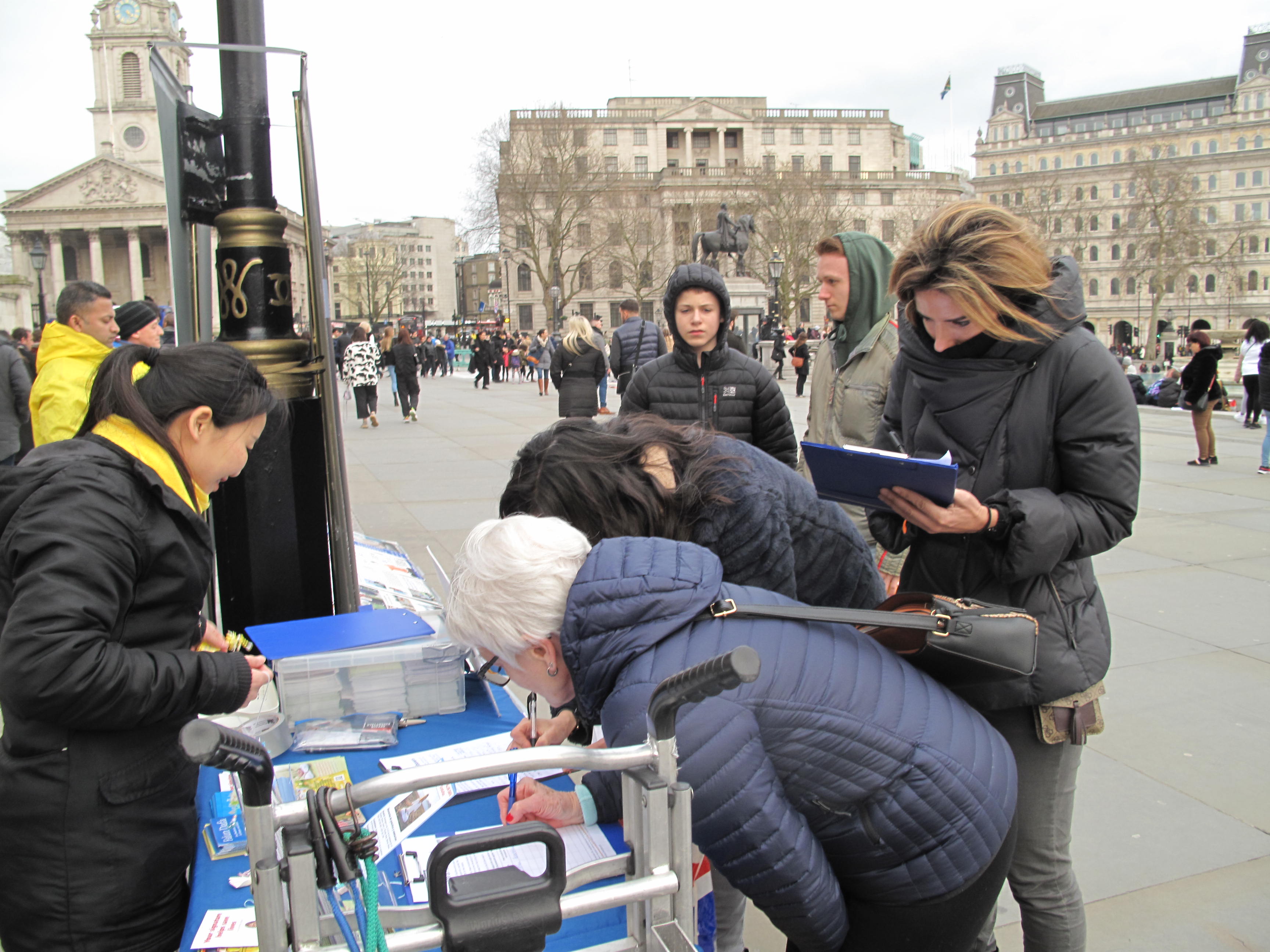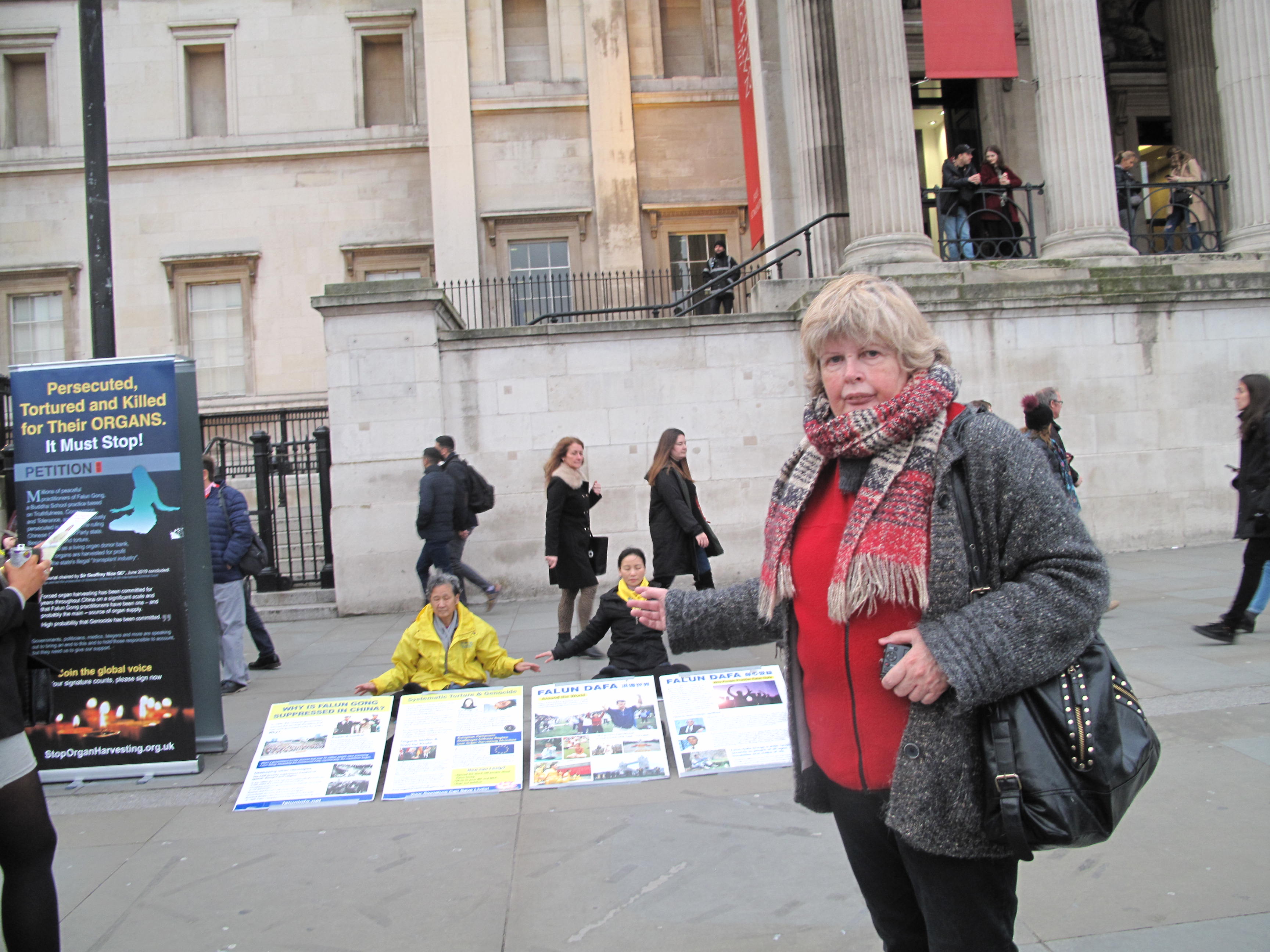当天,伦敦女士帕特(Pat)与两个从赫特福德郡(Hutfordshire)来伦敦探望她的孙子,康纳(Conor)和马根(Magen)路过特拉法加广场,老人看到法轮功学员真相展示后立即签名希望制止迫害,随后鼓励两个孙子也签了名:“我希望他们也了解世界上正在发生什么”。康纳认为:“(中共)从人身上强制摘取器官,那是不对的,是错误的。”三人都表示回去后一定进一步了解法轮功。