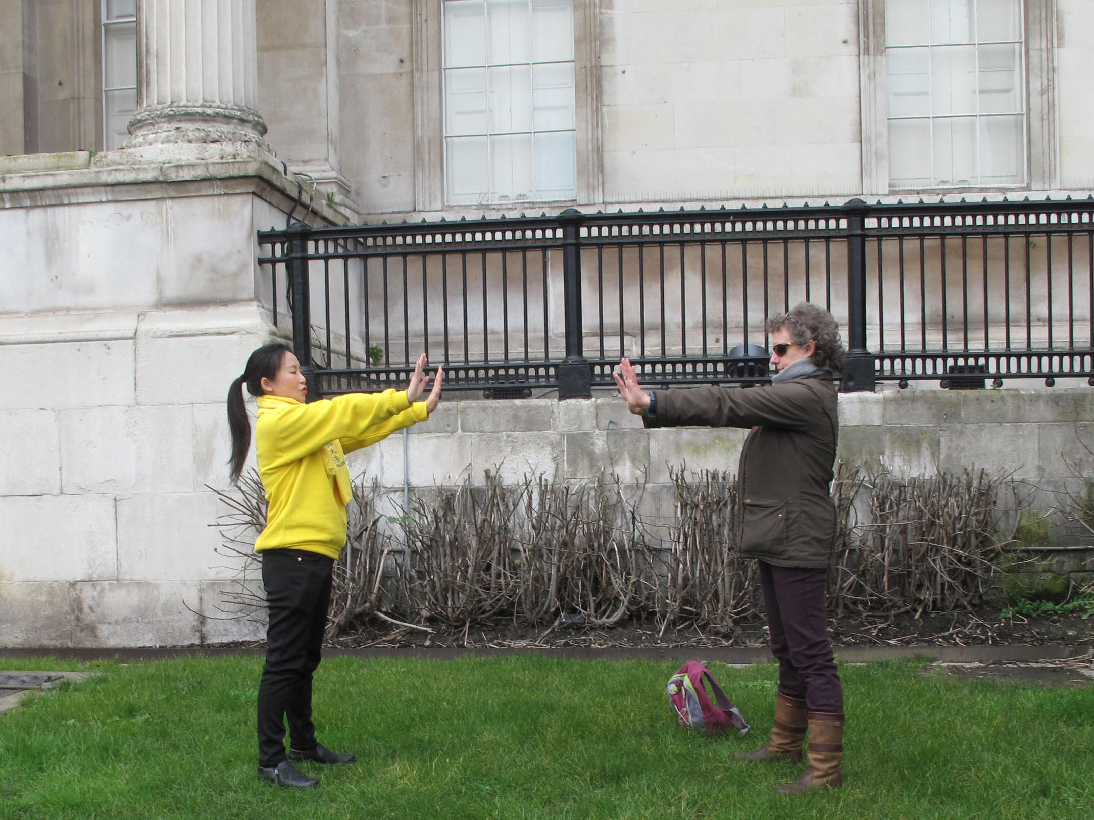 ![]() 图10:二零二零年三月七日,在特拉法加广场北台阶前,法轮功学员在教来自兰开斯特郡(Lancastershire)的英国女士克里斯汀(Christine)(右)学炼法轮功功法动作。 |
