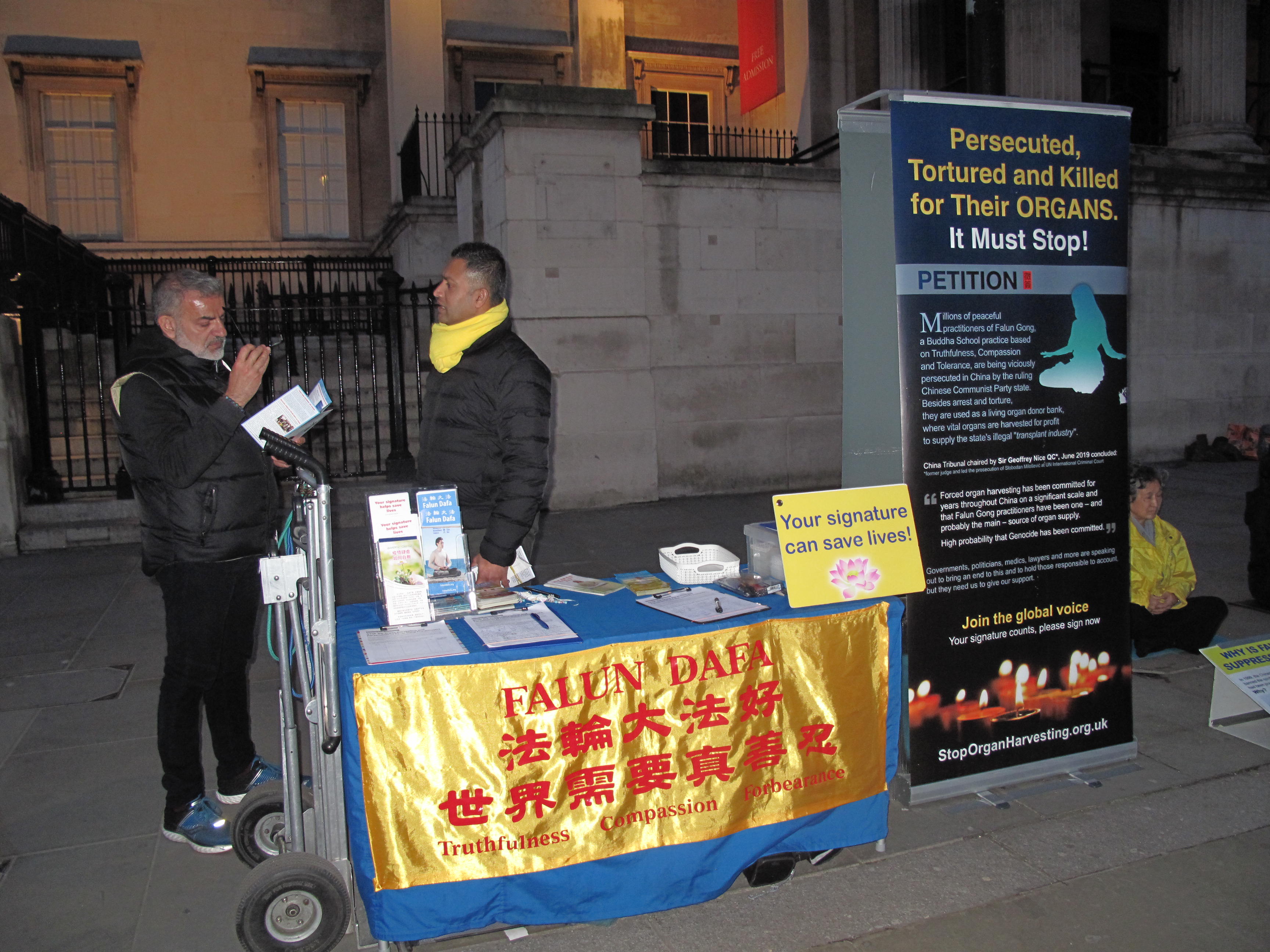 近几周来,虽然特拉法加广场的人流没有往日多,不过,当日的活动还是吸引不少民众驻足感受法轮大法的祥和美好和慈悲能量,了解什么是法轮功,弄清中共为什么要迫害法轮功,为什么会有活摘法轮功学员器官这样的邪恶在中国发生。明白真相的民众纷纷签名支持法轮功学员反迫害。