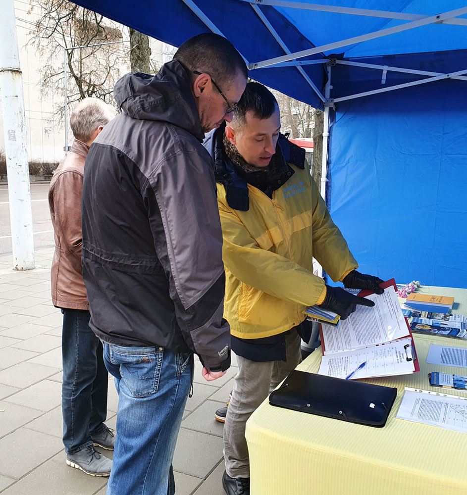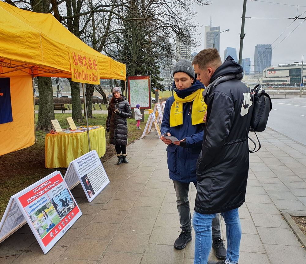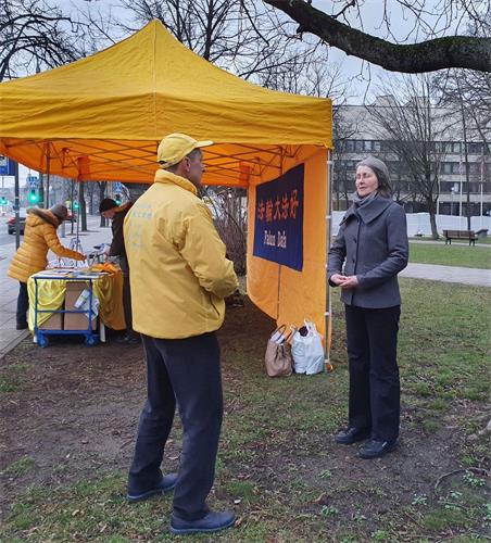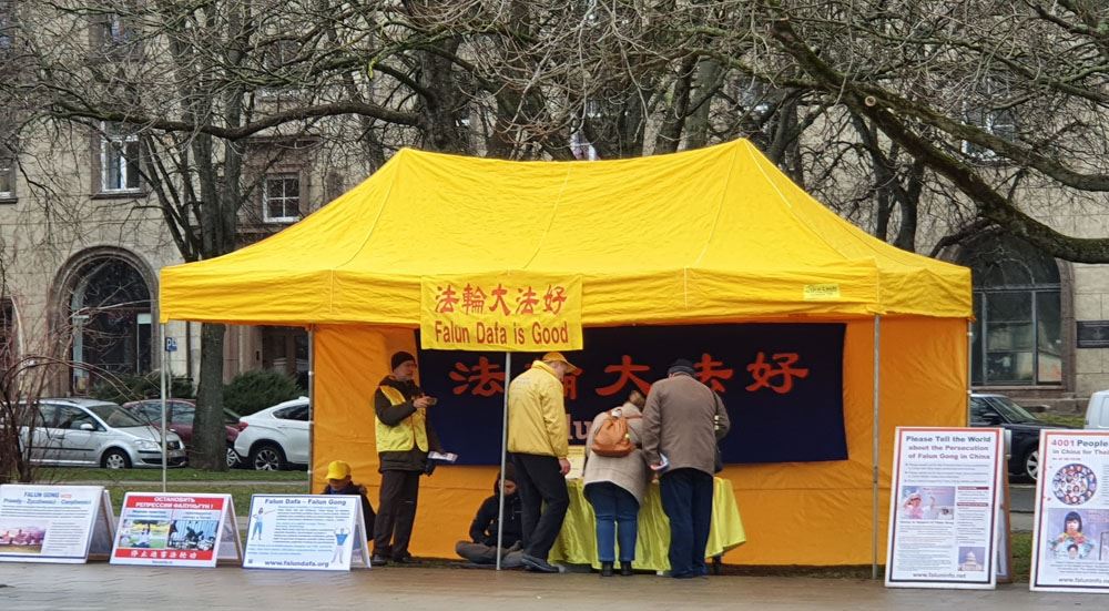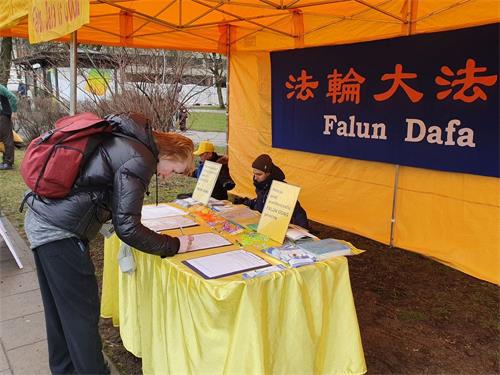 【明慧网二零二零年三月十五日】(明慧记者何平斯德哥尔摩报道)瑞典法轮功学员在斯德哥尔摩市中心国会大厦(Riksdag)旁的钱币广场(Mynttorget)设立了真相点,他们在这里举办讲真相反迫害的活动已经坚持很多年了。二零二零年三月十四日,又是一个阳光灿烂的周六,法轮功学员与往常一样,竖起“停止迫害法轮功”醒目的横幅、摆上真相展板,在这里举办讲真相活动。