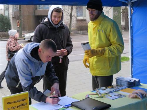 还有两位中年男士,了解了真相后马上签字,并对学员说:“我知道了这是中国一个古老、传统的功法,中共它就是来破坏传统文化的,感谢你们常常出现在这里,告诉人们真相做得非常好、我们支持你们!”
