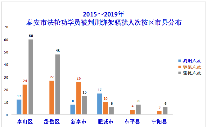 ![]() 二零一五年~二零一九年泰安市法轮功学员被非法判刑、绑架、骚扰按区市县分布图 |