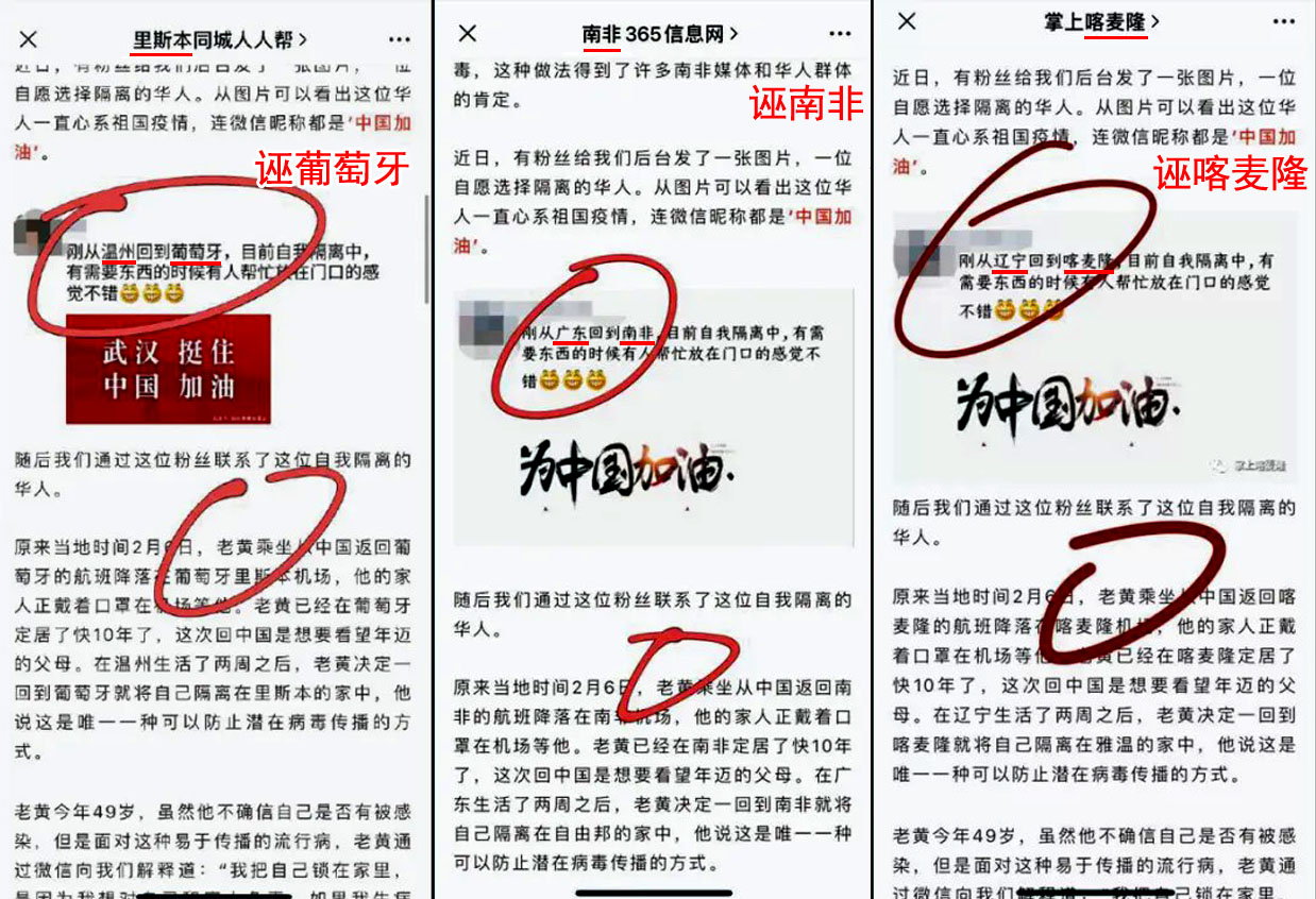![]() 图9:海外各国的华人社交平台上,搜索到版本统一的中共造谣文章,地名不同,其它雷同(截图6) |