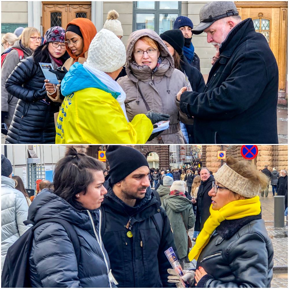 一位住在乌普萨拉、来自伊朗穿着得体,高雅文静的女士和她的瑞典男友,站在真相展板前仔细的观看、阅读并与当地伊朗族裔的法轮功学员交谈了很久。学员向他们介绍法轮功、以及在中国仍在发生的中共活摘法轮功学员器官牟取暴利的罪恶。中共的恶行令他们很是气愤;而法轮大法的祥和与美好让他们感动,俩人当场跟着学员学炼功动作。这位女士告诉学员,她现在正在乌普萨拉一所医科大学里做关于人脑的研究课题,当她得知那里也有炼功点时,非常的高兴,表示会尽快联系。临走前,她还留下了自己的联系方式。