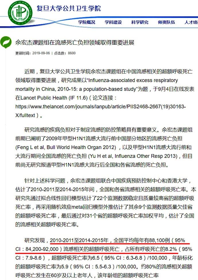 ![]() 图3:复旦大学公共卫生学院研究成果报告:全国每年流感超额(相关呼吸道疾病)死亡超过8.8万人 |