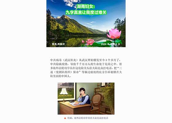 这些年来,我把师尊要求的三件事摆在首位,每天早晨和全球同修同步炼功,上午学法、背法,下午出去讲真相救人。回来,上明慧网看同修的交流文章,我还担负向大纪元退党网站报三退名单的使命。