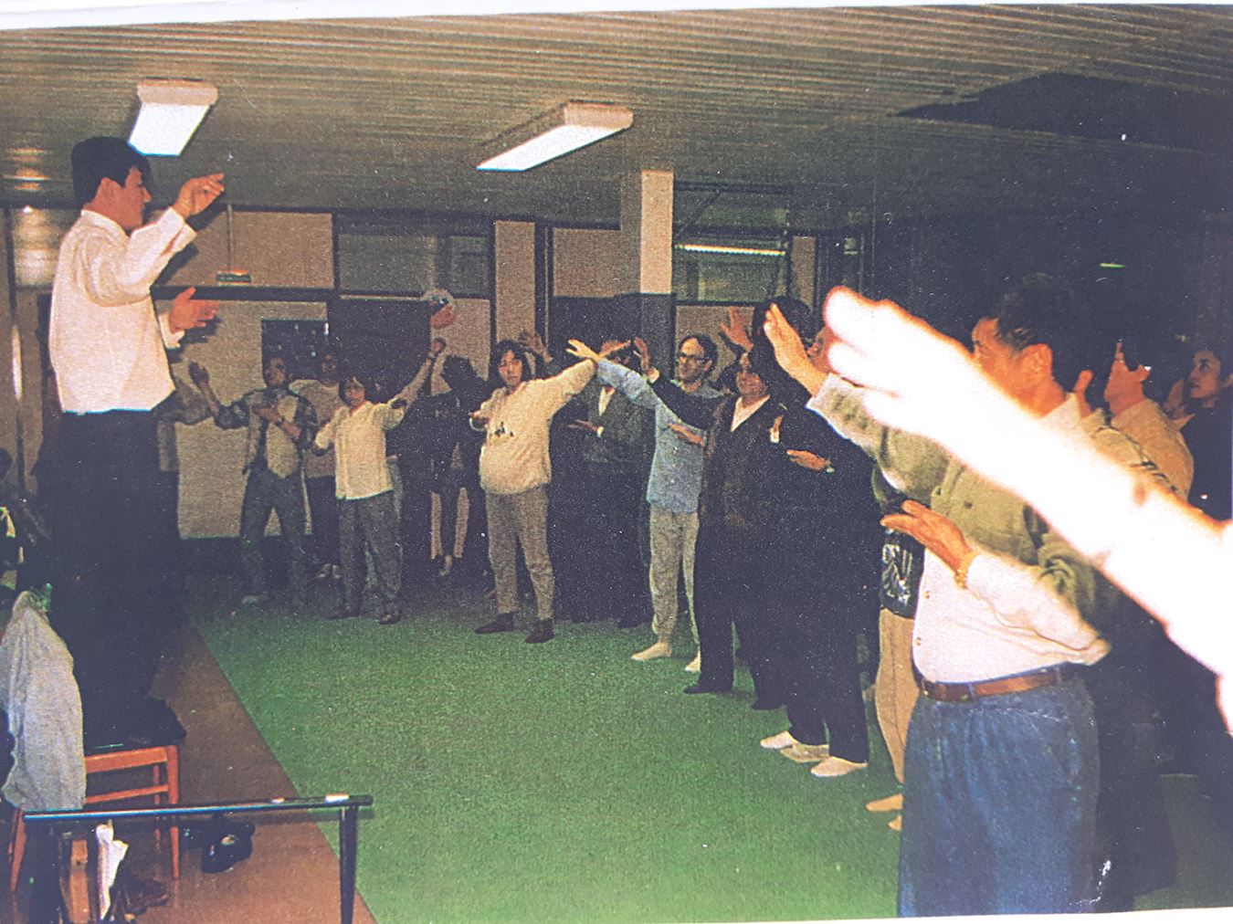 周女士继续回忆到:每天讲完课后,师父都要教我们炼功。教第一套功法时,因为人多,为了让大家都能看得见,师父双脚一脚踩在一把椅子上,这样站得高一些,让大家都能看得清。