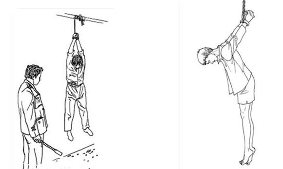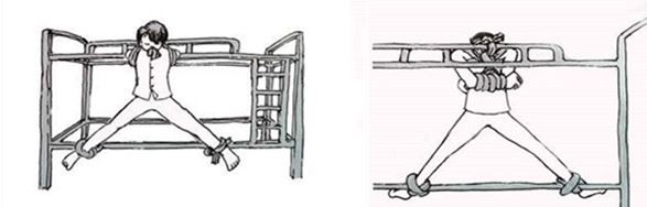 ◎抻刑中还有一种更为残忍的形式叫“五马分尸”。据长春学员李知秀回忆说:“闫璐璐和孙永静把我的手拉到头的上方绑到暖气管子上,手和管子之间没有一点空隙,绑的死死的,身体躺在床上而脚要绑到另一张靠门口那张床上,手、身子、脚呈大字形绑上,看我不妥协,就找来四个人把门口那张床用力往出拉,两张床原来是挨着的,这样把两张床之间抻出大约二三十公分的距离,身体悬空,被抻的直直的,这种抻刑迫害导致我流血不止、一直处于昏迷状态。”