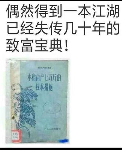 有大陆网友分享了一本题为《亩产七万斤的技术措施》的书,并调侃地称其为“一本江湖已经失传几十年的致富宝典”。经历过文化大革命浩劫的几代人,一看就知道,这本书是“大跃进”时期的产物,宣传党的“伟大、光荣、正确”。