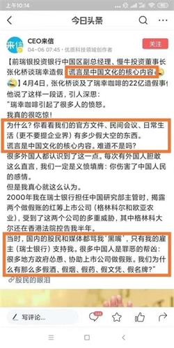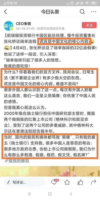 曾被誉为星巴克最强对手的中国咖啡品牌“瑞幸咖啡”,最近突然发布公告表示,已经成立特别委员会调查内部业绩造假问题,承认首席执行官和部分员工,伪造高达人民币22亿、约合新台币93亿的业绩。消息传出后,很多中国人感到愤怒。对此,一位前瑞士银行投资行中国区副总经理指出,“你看看我们的官方文件、民间会议、日常生活有多少假大空的东西。谎言是中国(中共)文化的核心内容。难道不是吗?”
