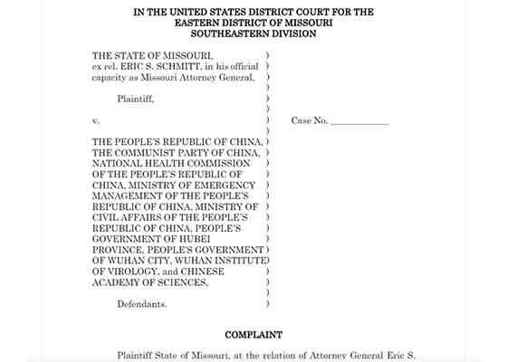 4月21日,美国密苏里州就中共隐瞒疫情带来的严重后果,起诉中共。诉讼要求中共就其隐瞒疫情而造成的巨大生命损失、人类痛苦和经济动荡进行赔偿。