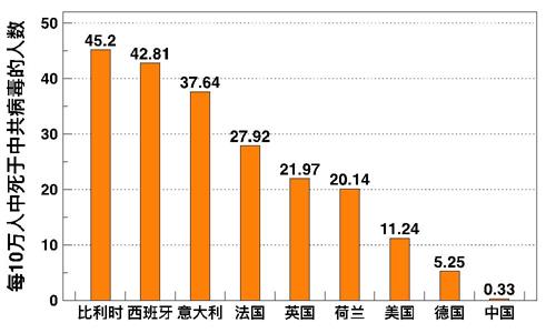作为美国顶级的医疗专家,博克斯解释说,在每10万人中,比利时和西班牙的死亡率是最高的,分别达到45.2和42.81,接下来是意大利的37.64、法国的27.92、英国的21.97和荷兰的20.14,然后是美国的11.24和德国的5.25。而中共提供的数据显示,在每10万个人中,只有0.33人因感染中共病毒死亡。(图二)