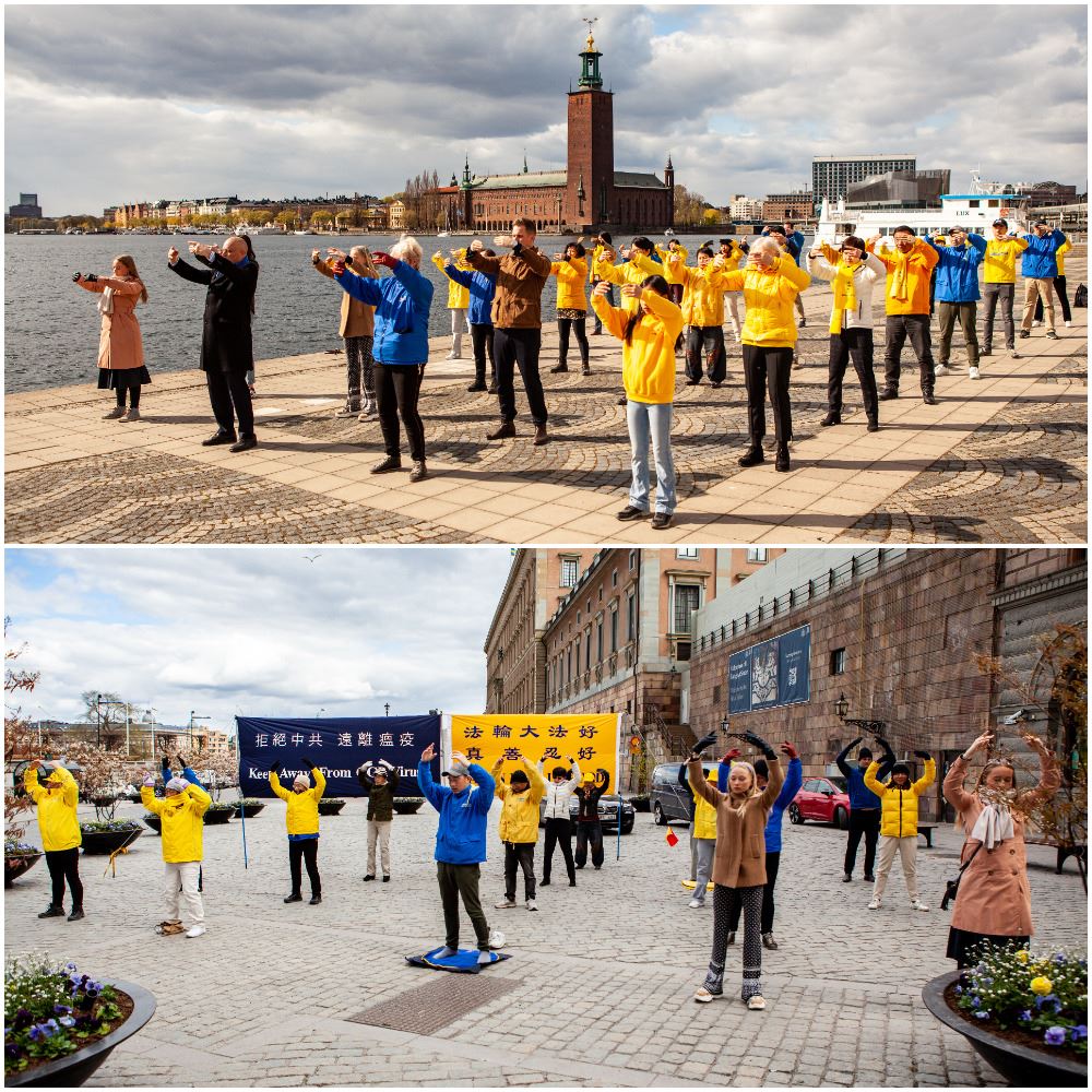 图7:瑞典法轮功学员在斯德哥尔摩市中心国会大厦旁的钱币广场、斯德哥尔摩市政厅旁炼功、传播真相