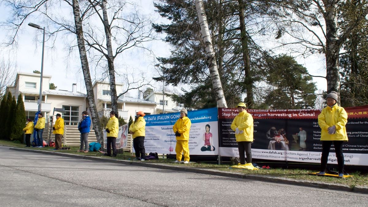 【明慧网二零二零年四月二十六日】一九九九年四月二十五日,万名中国法轮功学员为了维护对“真善忍”的信仰到北京和平上访,其规模与上访者的和平理性震惊了世界。二零二零年四月二十四日芬兰法轮功学员和往年一样,聚集到大使馆前,和平纪念二十一年前的这一天,抗议中共对法轮功学员的迫害