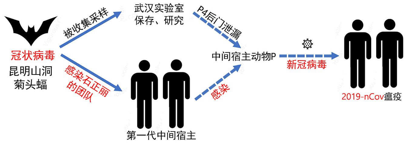 由此,石正丽勾画出一条2003年非典瘟疫的传染途径:该山洞蝙蝠的天然SARS病毒——感染云南人工养殖的果子狸——卖到广东市场(病毒若干代繁衍变异为SARS-CoV)——人中爆发。