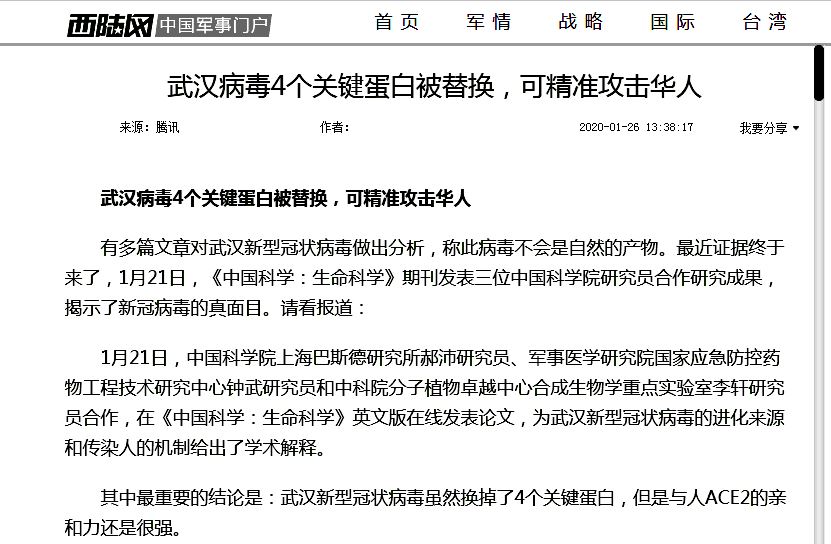 百姓的愤怒飙升之时,作为中国军事门户新闻网站的西陆网,1月26日刊登《武汉病毒4个关键蛋白被替换,可准确攻击华人》一文,大力推出“美国阴谋论”,愤然指出武汉病毒是美国的基因武器。
