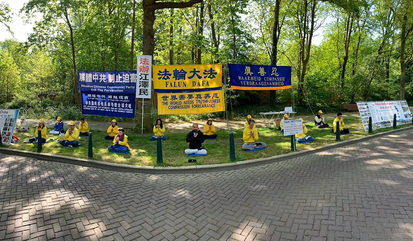 为纪念四二五和平上访,二零二零年四月二十四日,部份荷兰法轮功学员们来到中共邪恶政权住荷兰大使馆前和平抗议,展示法轮大法的美好,揭露中共对大法弟子残酷的迫害。同二十一年前一样,没有口号,没有喧嚣。当天悬挂的横幅上书写着中英文“法轮大法”,“世界需要真善忍”,“解体中共”,“制止迫害”。其中一个横幅“中共隐瞒疫情导致全球灾难”揭露了中共恶党病毒对全世界的伤害。