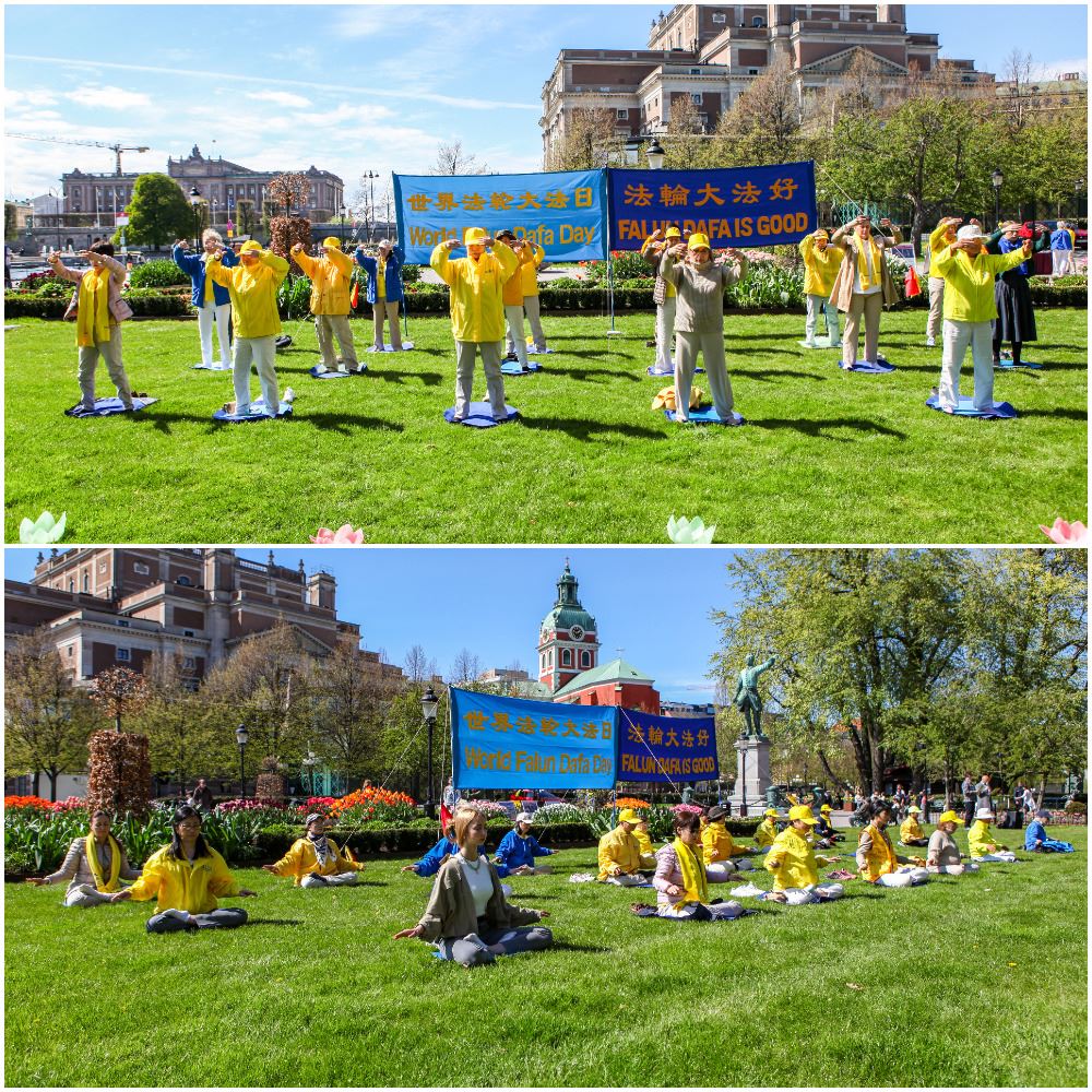 ![]() 图1:瑞典法轮功学员聚集在首都斯德哥尔摩皇家花园,庆祝即将来临的第二十一届“五一三世界法轮大法日”,法轮功学员集体炼功、向世人展示功法。 |
