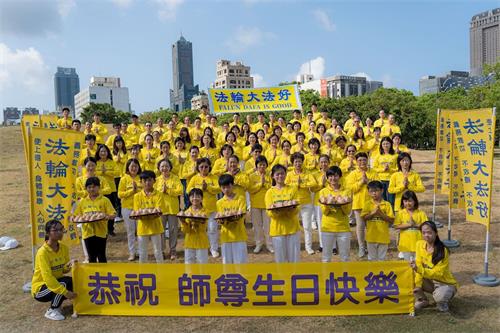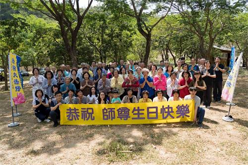 为配合高雄政府的减少群聚人数的防疫策略,高雄法轮功学员于五月份的两个周末假期分梯次举办活动,延续上周的庆祝后,五月九日、十日分别在瑞丰夜市真相景点、大岗山自然生态园区、中央公园等处炼功弘法后合影,并双手合十齐声“恭祝师父生日快乐”。
