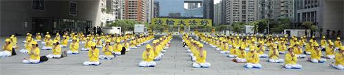 图1~3:台湾台中部份法轮功学员在台中市市政府广场前,以集体炼功弘法的形式,庆贺法轮大法日