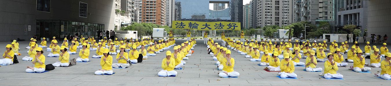 '图1~3:台湾台中部份法轮功学员在台中市市政府广场前,以集体炼功洪法的形式,庆贺法轮大法日'