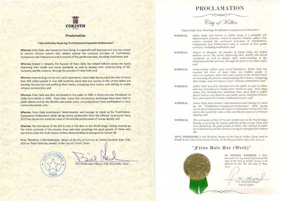 - 大达拉斯地区两城市宣布“世界法轮大法日”- 北德州大达拉斯地区的凯勒市的市长帕特·麦克贵尔和科林斯市市长比尔·海德曼分别宣布2020年5月13日为自己城市的“法轮大法日(周)”。