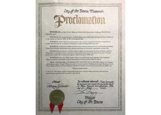 - 美国密苏里州圣彼得市宣布法轮大法日(图)- 在第二十一届“世界法轮大法日”和法轮大法弘传世界二十八周年即将来临之际,美国密苏里州圣彼得市颁发褒奖,宣布法轮大法日。