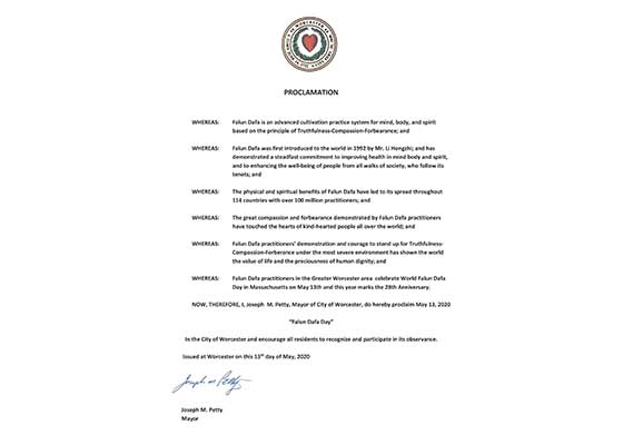 - 美国麻州渥斯特市长褒奖祝贺“法轮大法日”- 二零二零年五月,美国麻州渥斯特市市长颁发了祝贺法轮大法日的褒奖,并宣布二零二零年五月十三日为“法轮大法日”。