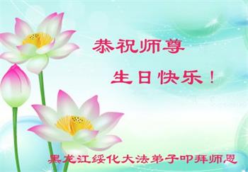 - 黑龙江大法弟子恭贺世界法轮大法日暨师尊华诞(21条)- 弟子真心感谢师父的慈悲保护,今后在师父的加持下更加精進,更加努力做好三件事,让师父多一些欣慰。少一些操劳。叩拜师尊!