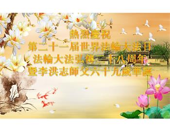 - 上海大法弟子恭贺世界法轮大法日暨师尊华诞(21条)- 弟子感谢师父的救度之恩,在这最后的时刻,弟子唯有珍惜修炼的机缘,珍惜师尊用巨大承受换来的时间精進实修,做好三件事,多救人,兑现对师尊的承诺,完成自己的使命,惟愿师尊笑。