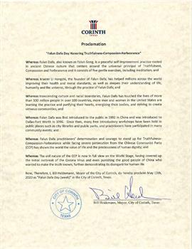 因此,现在,我,比尔·海德曼(Bill Heidemann),作为科林斯市市长,特此宣布二零二零年五月十三日为寇闰斯市“法轮大法日(周)”。