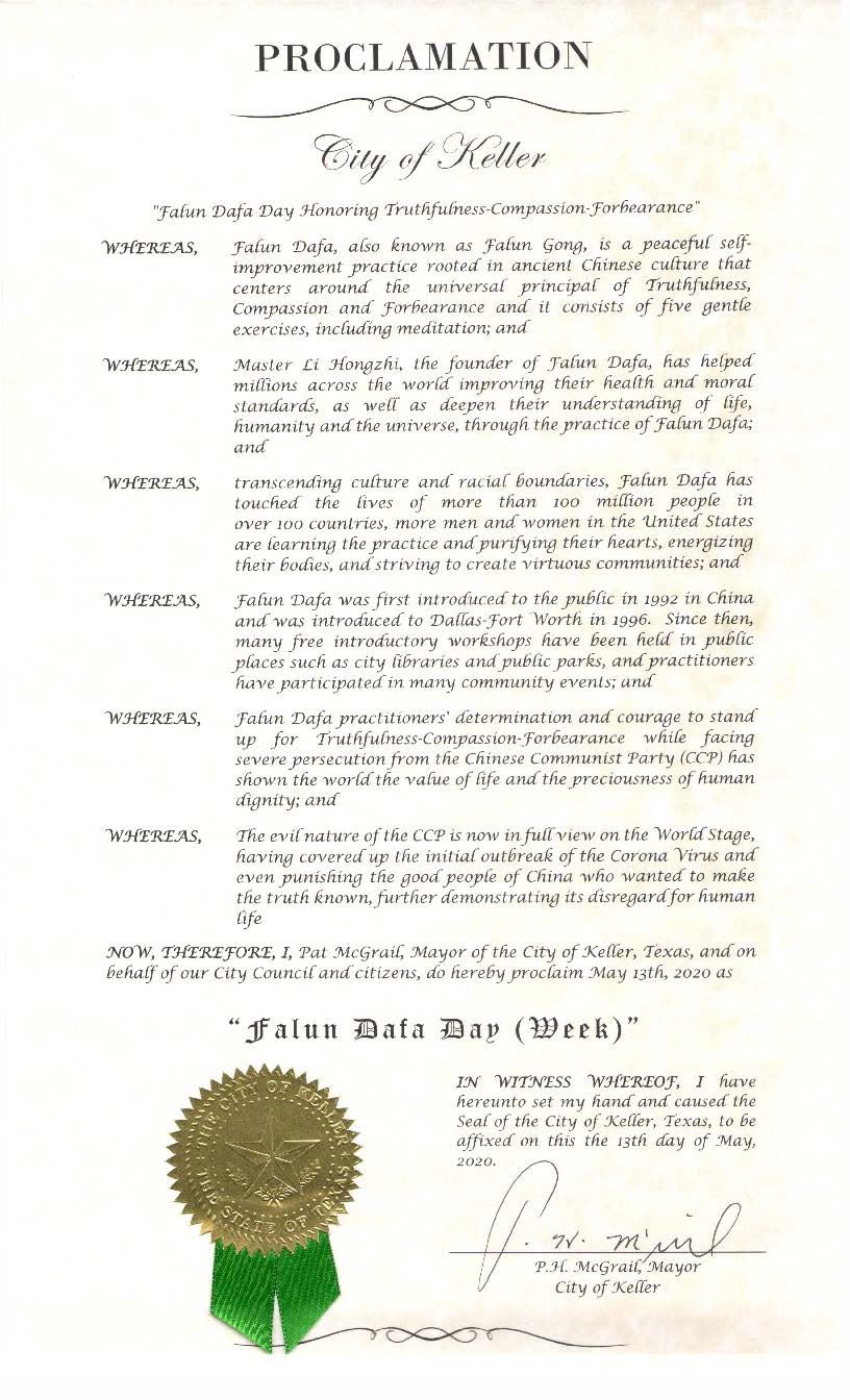 因此,现在,我,帕特·麦克贵尔(Pat McGrail),作为德克萨斯州凯勒市市长,代表市议会和市民,特此宣布二零二零年五月十三日为凯勒市“法轮大法日(周)”。