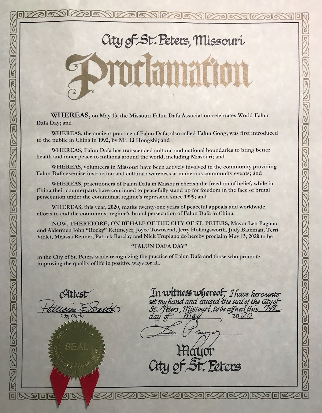 鉴此,市长蓝·帕格诺,市议员约翰“洛奇”雷特迈耶、珠丽丝·汤森德、杰里·霍林斯沃思、朱迪·贝特曼、特丽·维奥利特、玛丽萨·瑞曼、帕特里克·巴克莱、尼克·楚皮亚努,特此宣告二零二零年五月十三日为圣彼得市