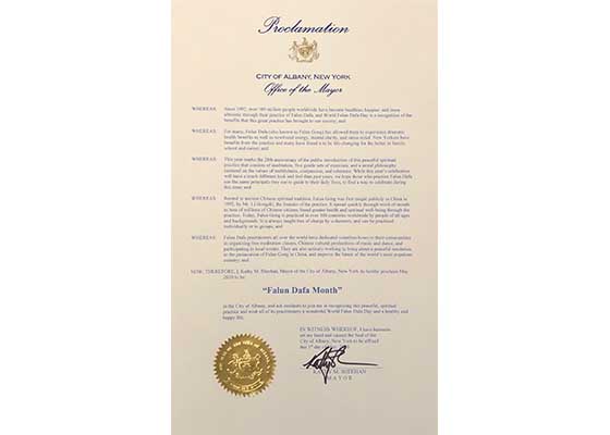 美国纽约州首府奥伯尼市市长凯西·施翰颁发褒奖,宣布二零二零年五月是奥伯尼市的“法轮大法月”。