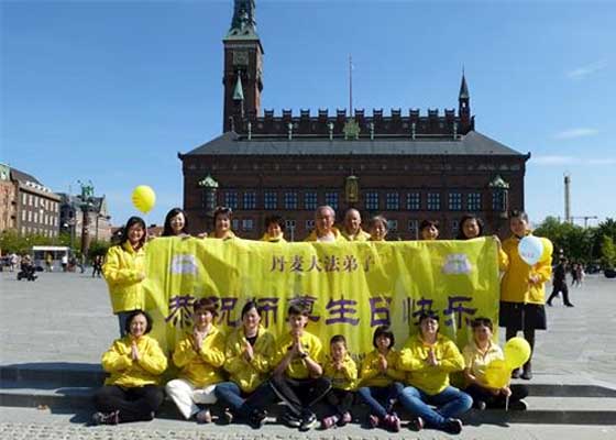 丹麦部份法轮功学员五月九日来到首都哥本哈根市区中心,庆祝法轮大法日暨师尊华诞,表达对慈悲伟大的李洪志师父的感恩之情。