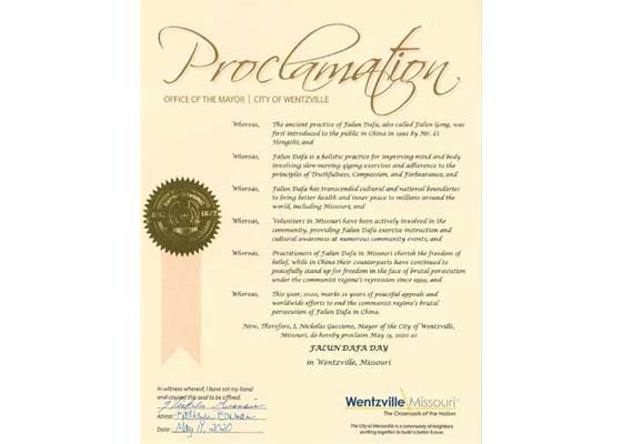 密苏里州温茨维尔市市长尼古拉斯·古奇昂近日颁发褒奖,宣布二零二零年五月十三日为密苏里州温茨维尔市的法轮大法日。