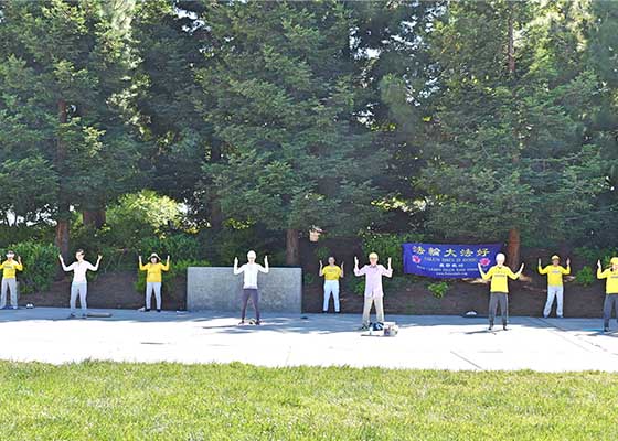 五月十日,旧金山湾区中半岛地区的部分法轮功学员在户外炼功,庆祝法轮大法弘传世界28周年暨法轮功创始人李洪志师父69岁华诞。