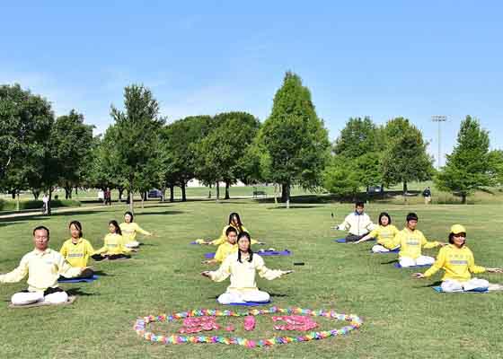 五月十日上午,达拉斯-沃斯堡地区的法轮功学员在几个不同的炼功点集体炼功来庆祝世界法轮大法日,恭祝师父生日快乐!