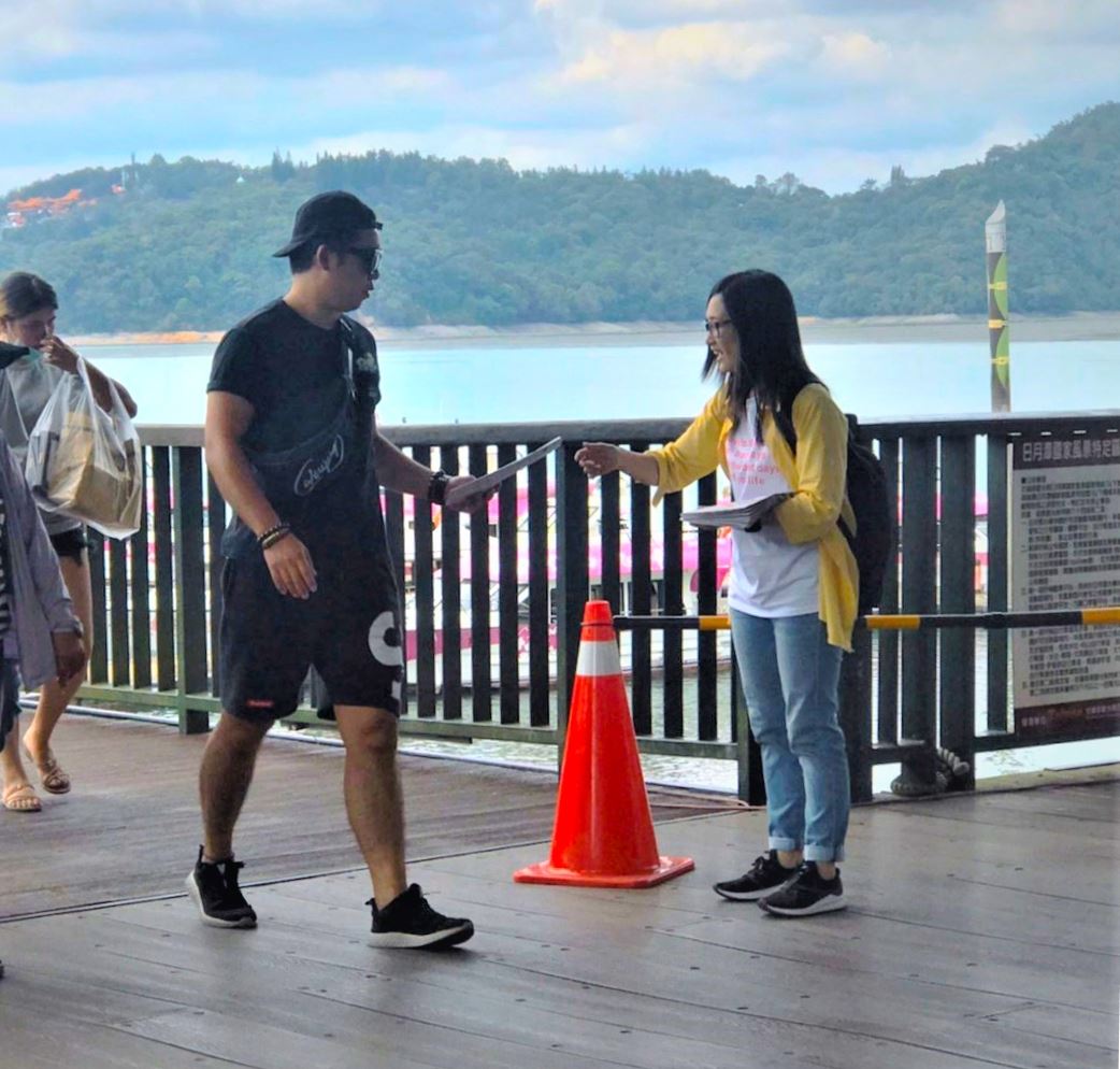 ![]() 图2:日月潭玄光寺步道上的法轮功学员讲真相、炼功,传递大法的美好。 |