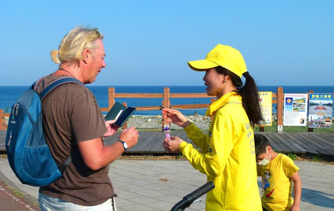 学员准备了串有九字真言“法轮大法好、真善忍好”的莲花,分送给民众,收到的人都很高兴,也签名声援法轮功反迫害。有位来自英国的游客表示,他很早就知道中共迫害法轮功,他强调:“共产党非常、非常的邪恶。”