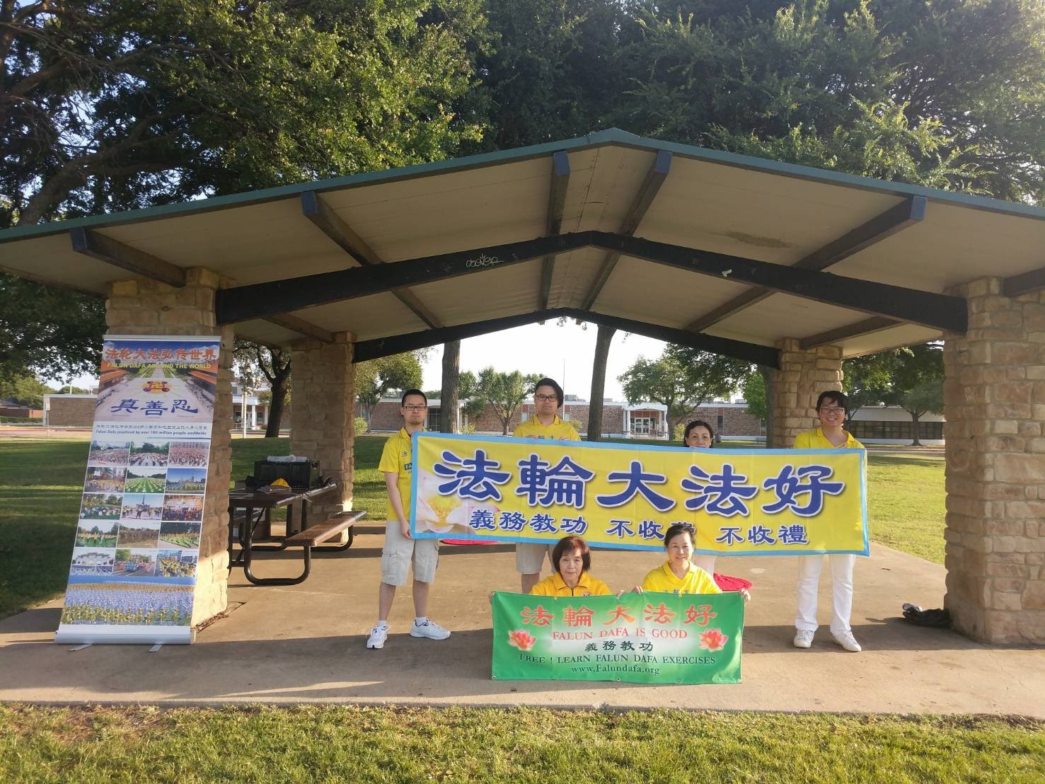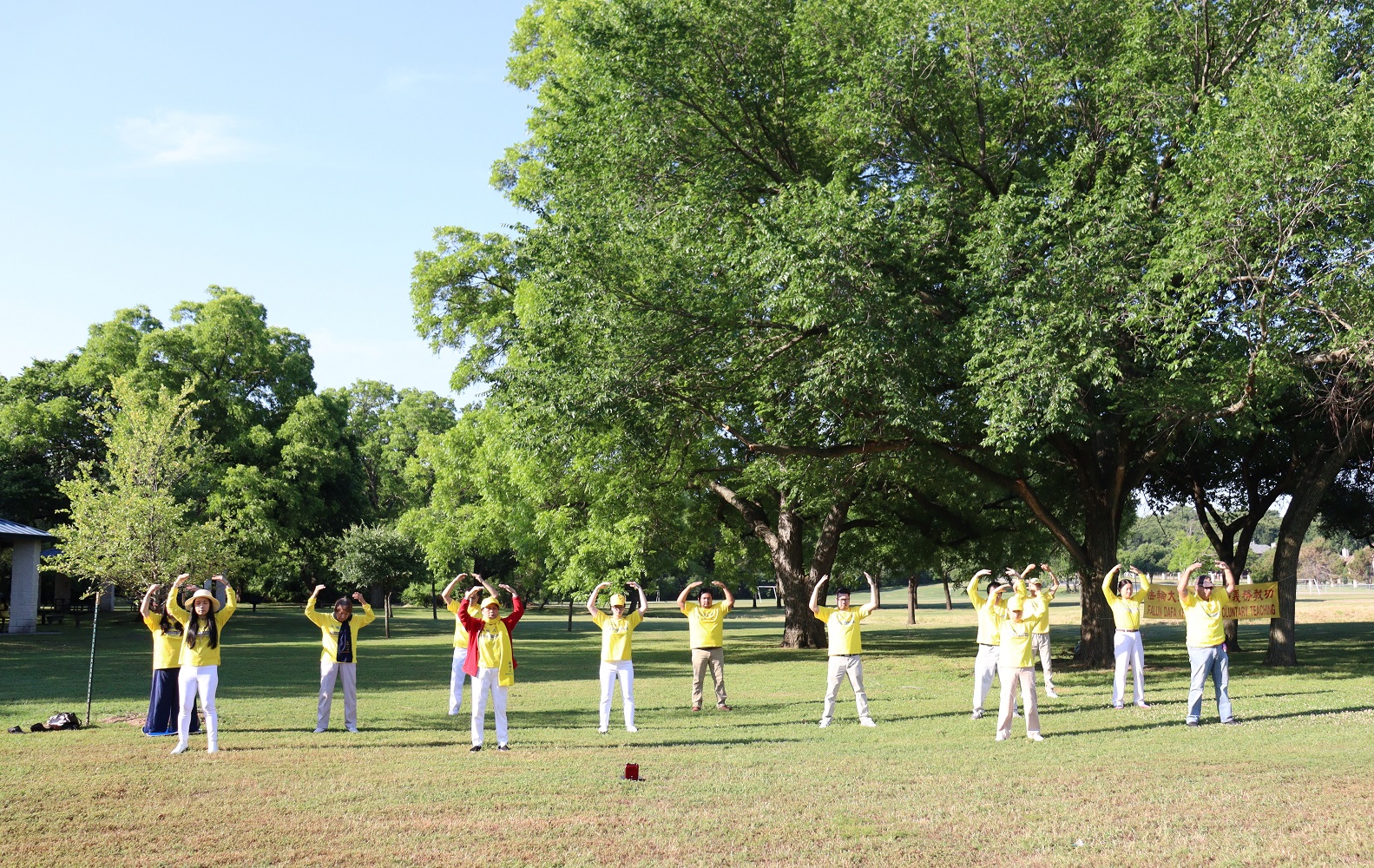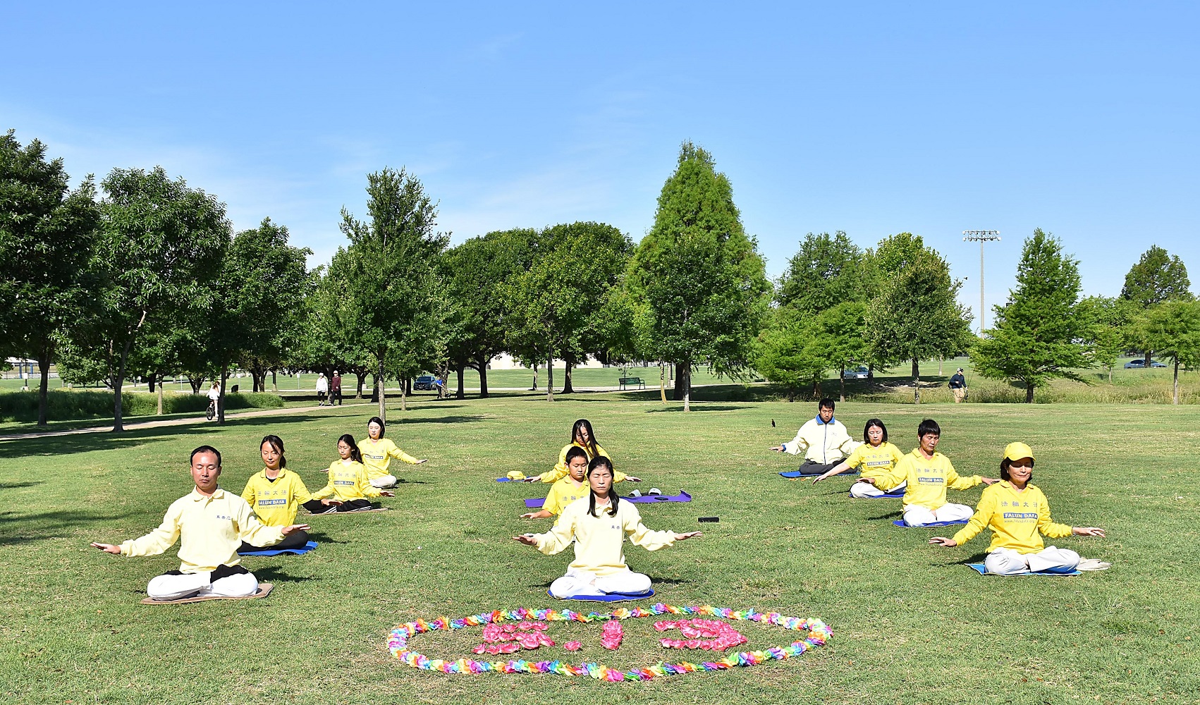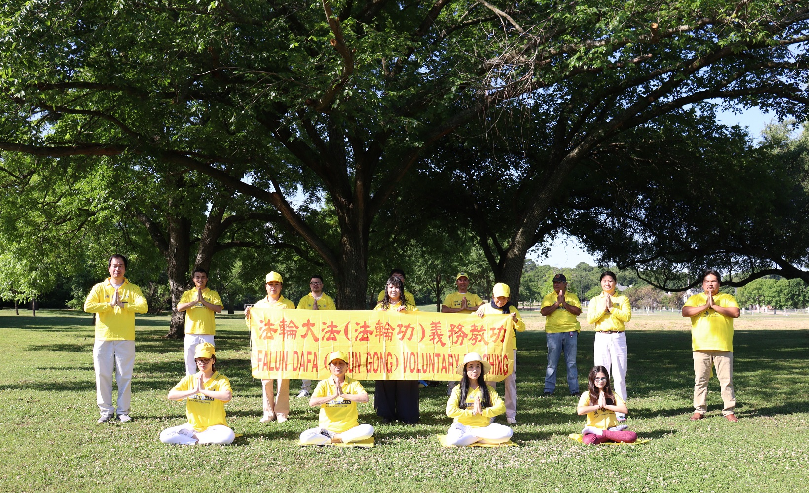 蓝天、白云,茵茵绿草,春风拂面,空气中飘着花香。法轮功学员们展开“庆祝法轮大法日”、“法轮大法好”、“法轮大法义务教功”等的彩色横幅,他们身着明黄色的T-恤衫、白色衣裤,分别在阿灵顿市的J.W.Dunlop运动中心公园、李察逊市Berkner公园炼功点、布兰诺市Russell Creek公园炼功点、布兰诺市Haggard公园炼功点集体炼功,为当地的居民的周末增添了一道道亮丽的风景。