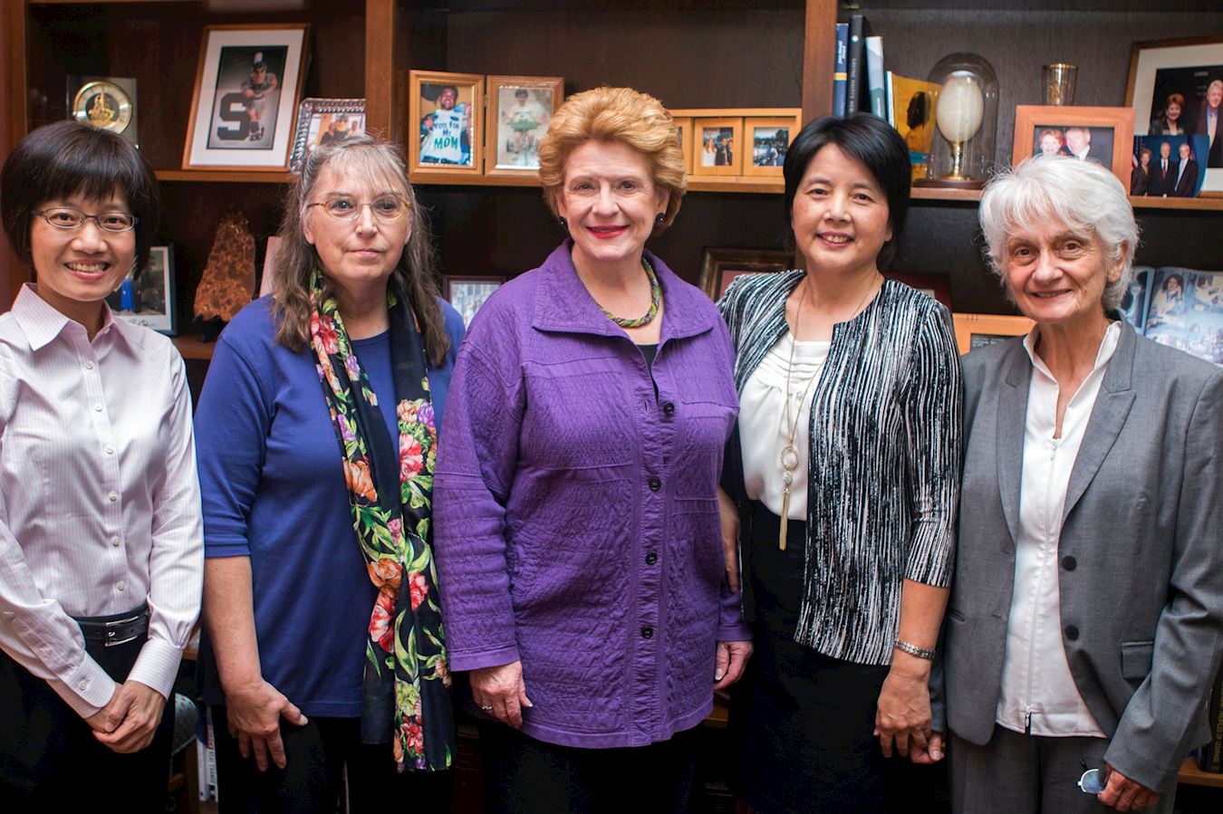 图7:谢欣玲教授(左一)其他几位法轮功学员在美国密西根州联邦参议员黛比·施塔贝诺(Debbie Stabenow)在华盛顿DC的办公室与Debbie(正中)的合影照。(谢欣玲提供)